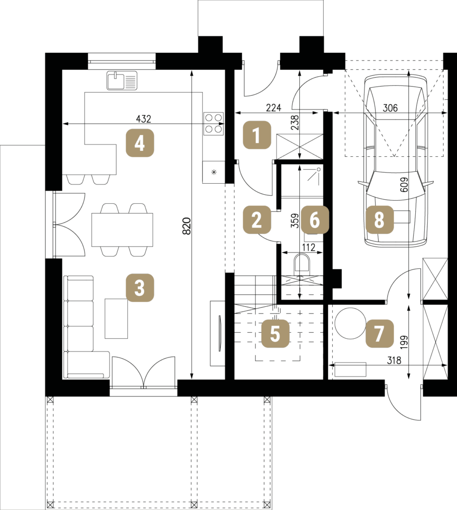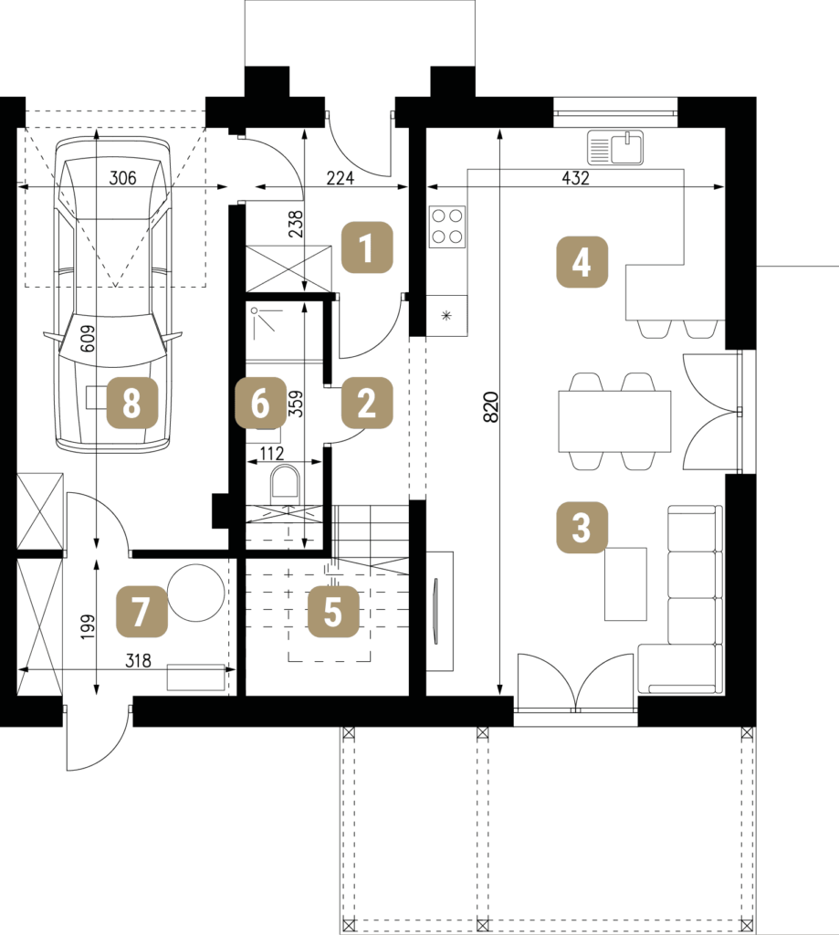 Na piętrze dostępny jest także duży balkon z przeszkloną balustradą. Można więc komfortowo wypoczywać na świeżym powietrzu. W bryle domu znajduje się jednostanowiskowy garaż, a przed nim 1 bądź 2 miejsca postojowe.