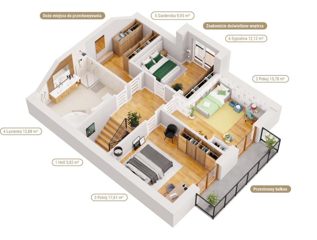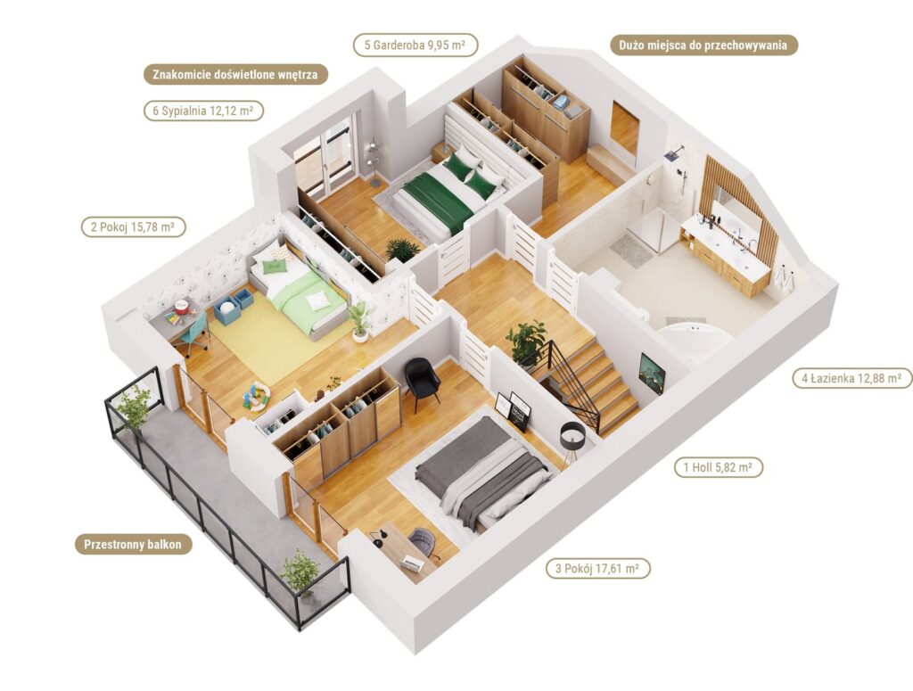 Każdy z nich ma powierzchnię użytkową 109,5 m² (154 m² powierzchni całkowitej) i wyróżnia się bardzo funkcjonalnym układem pomieszczeń, który dodatkowo można łatwo dostosować do indywidualnych potrzeb, wybierając np. 4 sypialnie na piętrze lub 3 sypialnie i gabinet do pracy. Do dyspozycji domowników jest również strych, na którym można przechowywać rzadziej wykorzystywane wyposażenie. Zwiń ∧