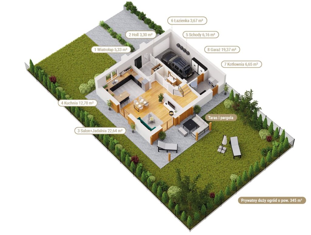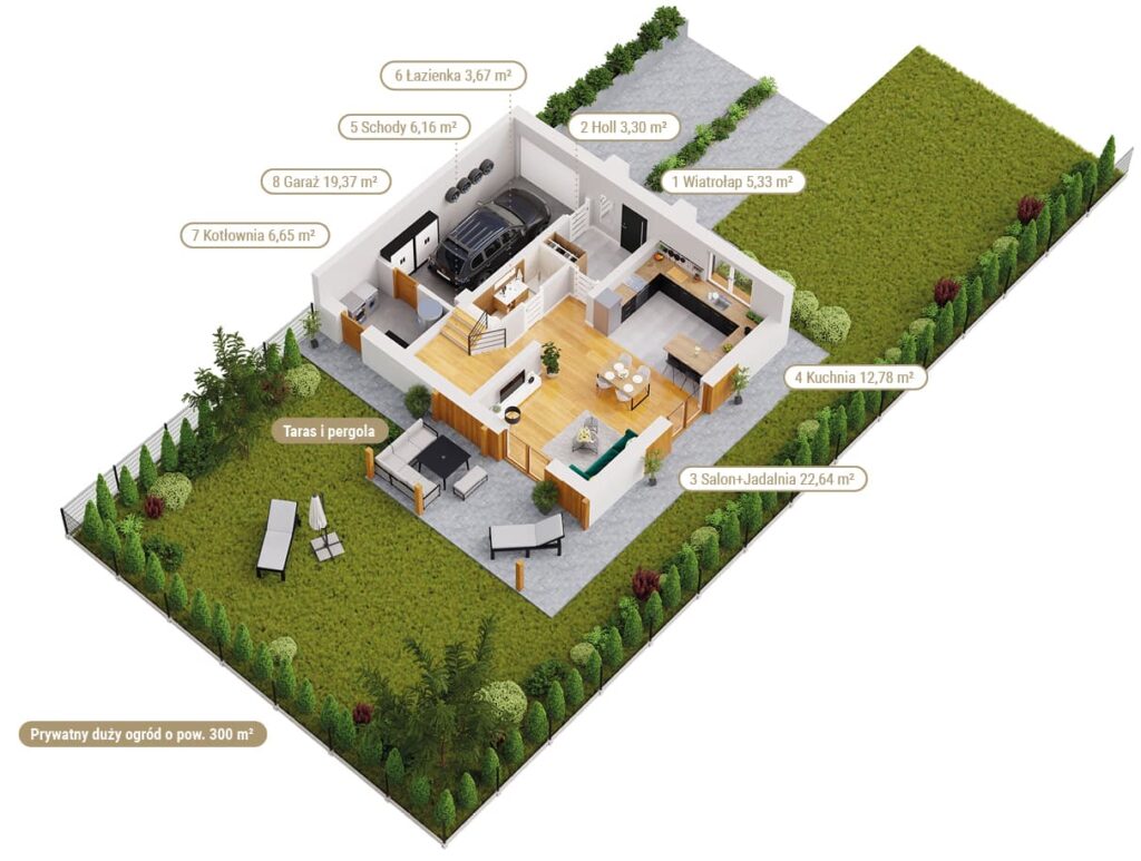 Do każdego domu przynależy duży ogród z tarasem i pergolą (ok. 450 m²), do którego wychodzi się z salonu lub z dodatkowego pomieszczenia, mogącego służyć jako kotłownia, pralnia czy suszarnia (osobne drzwi na zewnątrz).Rozwiń ∨
